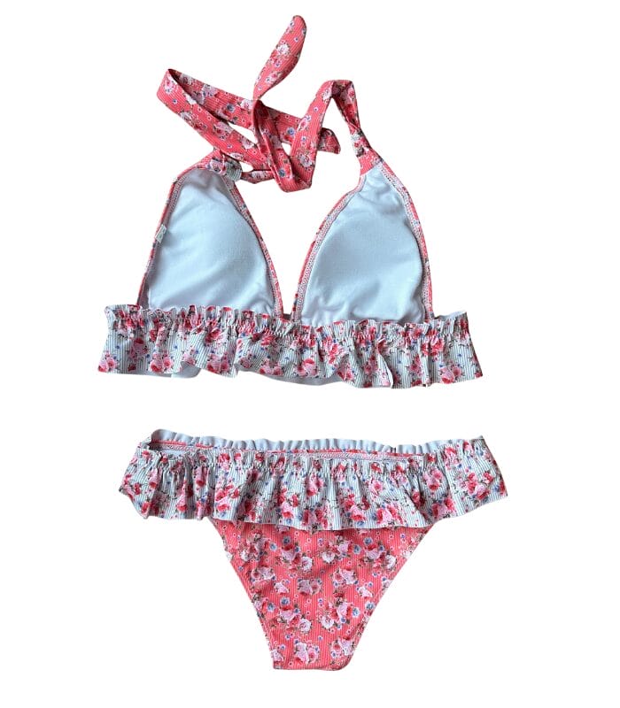 Biquíni rosa florido com folhos.