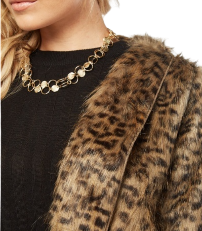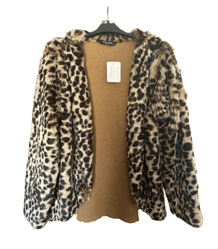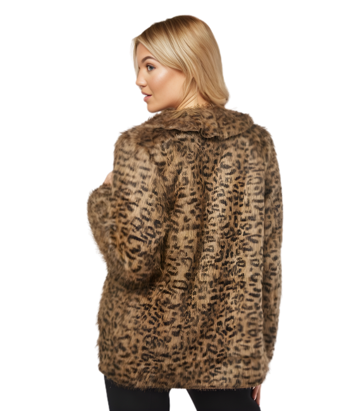 Casaco com pelo, padrão animal print em tons de castanho escuro.