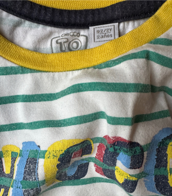 - T-shirt às riscas da Chicco – 92cm (mancha na gola – não foi testada a renoção)