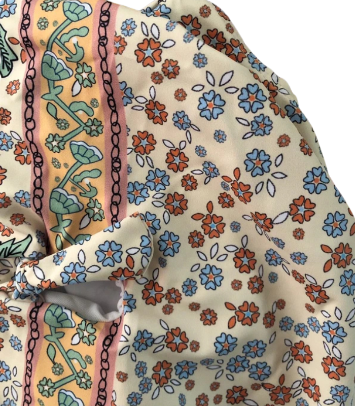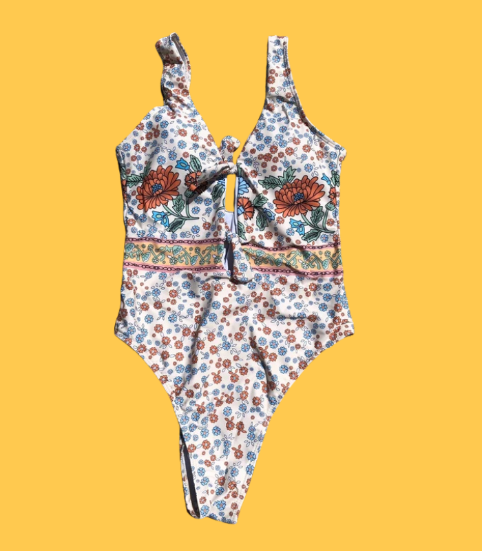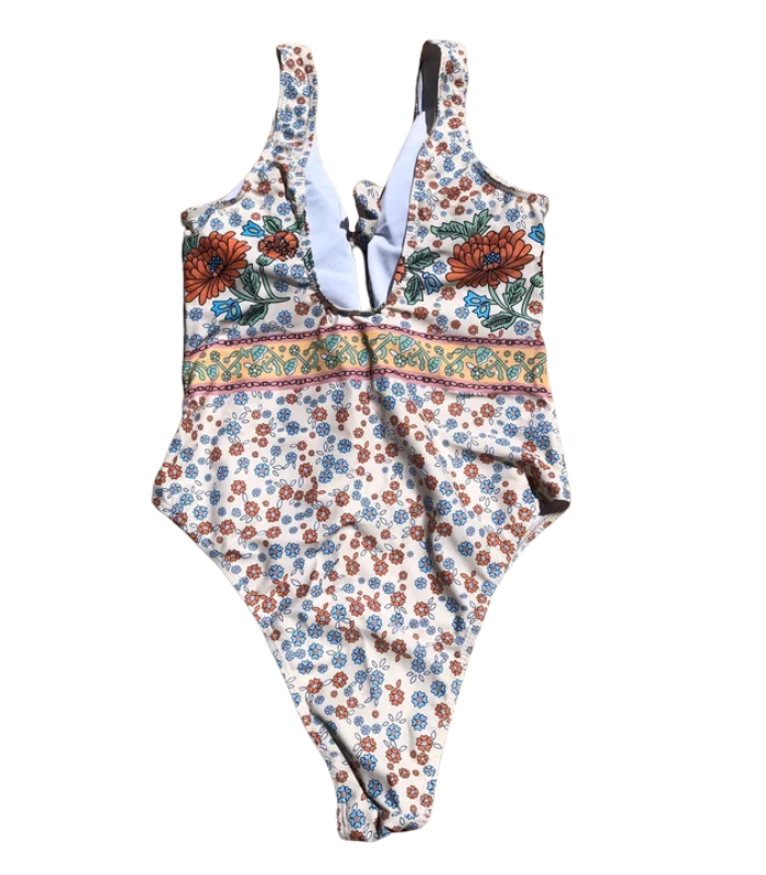 Fato de banho bege com motivos floridos e abertura frontal que fecha com laços.