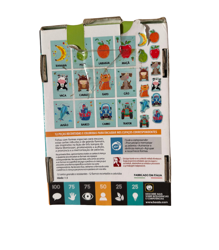 Feitas com formas especiais para encaixe, estas cartas robustas e de grande formato, são inspiradas na lição de três tempos de Maria Montessori, promovendo a audição, a pronúncia e a memorização de palavras.