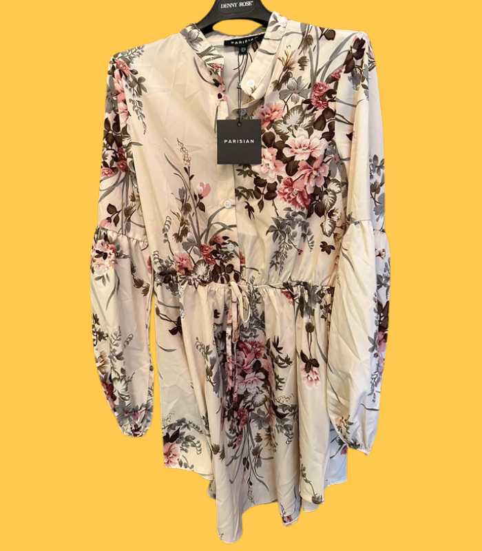 Vestido curto na cor bege com flores da marca inglesa Parisian. O vestido tem mangas compridas e pode ser usado com diferentes decotes.